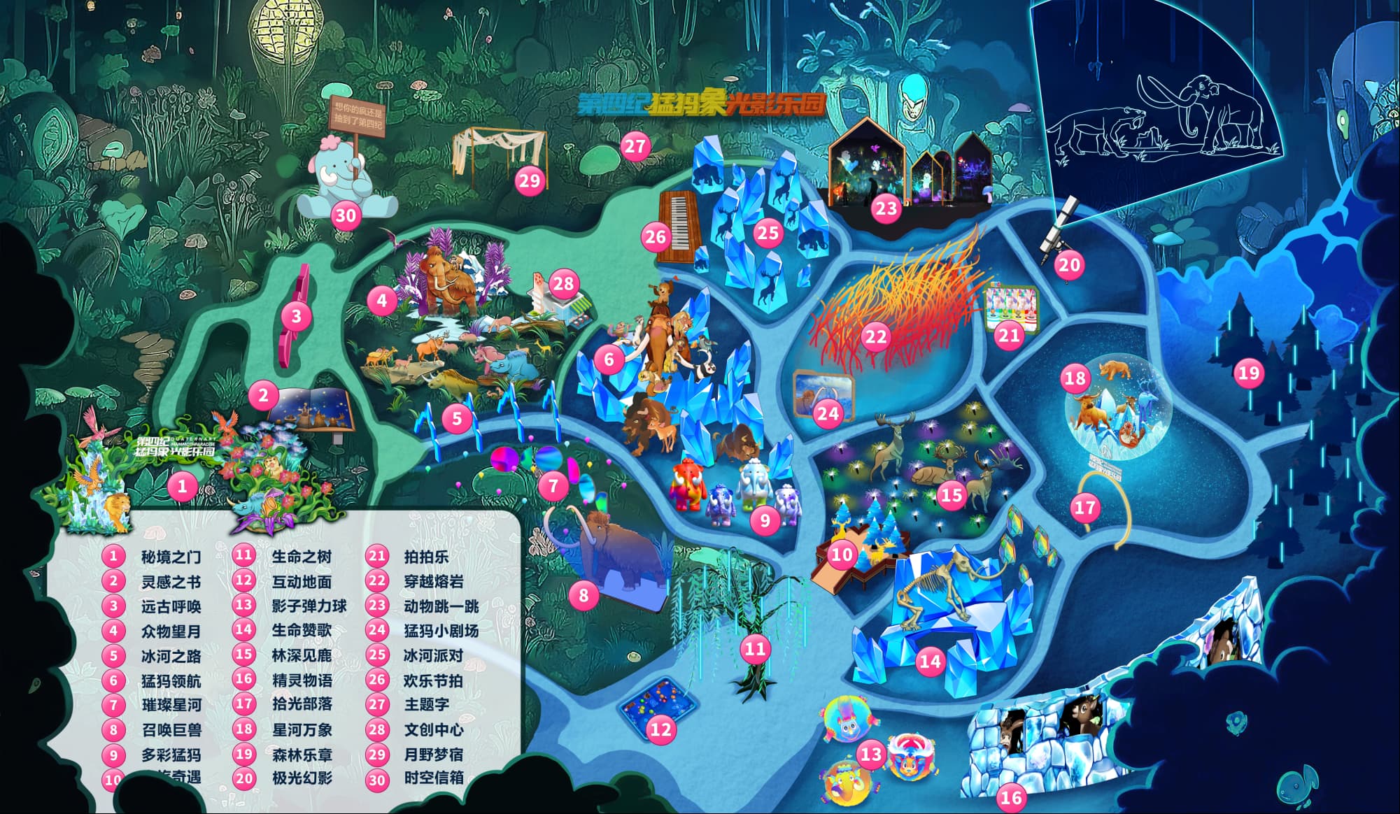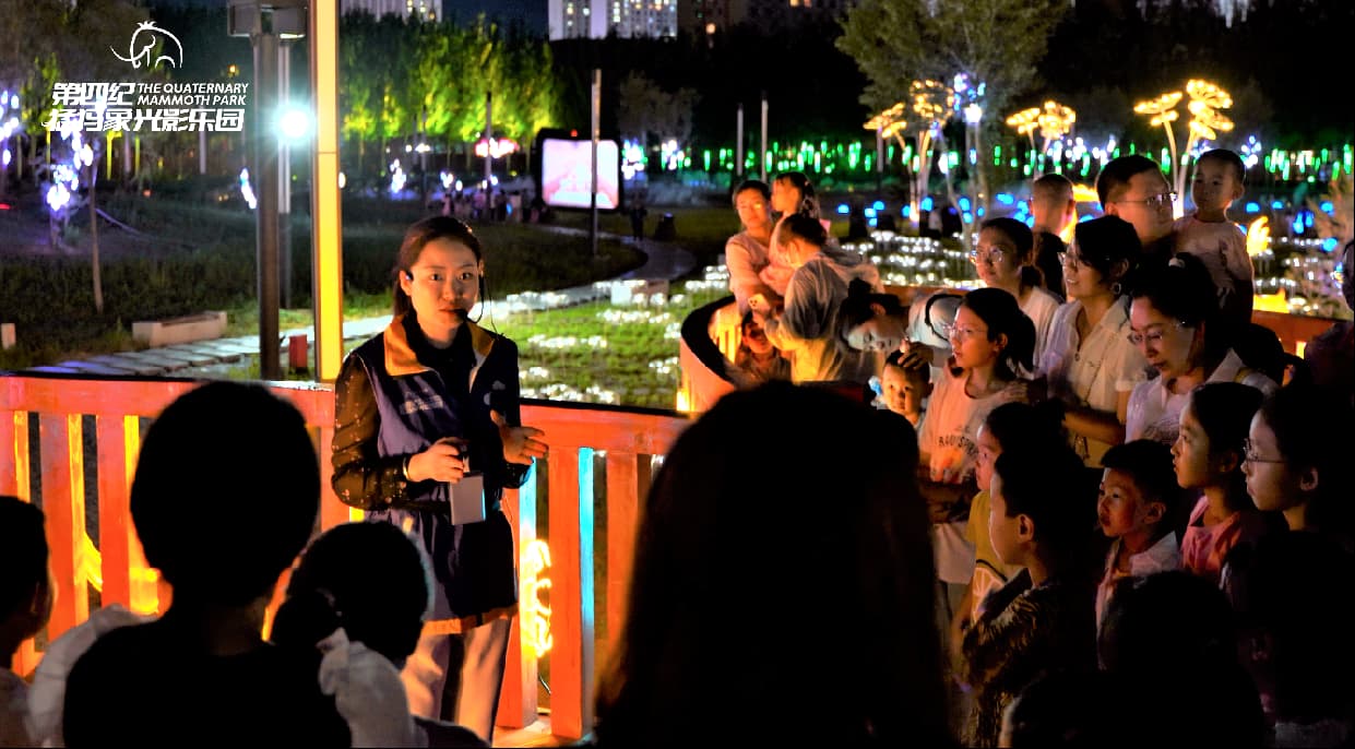 「第四纪猛犸象光影乐园」以展现第四纪冰河时期猛犸象文化为轴心,结合“一轴、双线、五场景”设计思路, 规划光影交互与剧本探秘双线体验形式,通过灯光装置、AR交互、体感识别等新媒体技术,创意打造光影互动、彩灯观览、 AR探秘、灯光秀场、拍照打卡五大场景, 立体还原猛犸象、披毛犀、东北野牛、大角鹿等史前巨兽。在生态从林中,以光为媒,唱响一支回荡百万年的冰河赞歌。