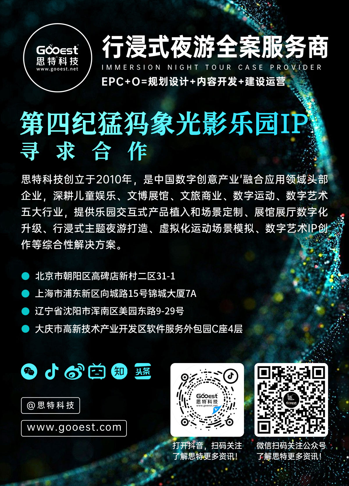 思特科技创立于2010年,是中国数字创意产业'融合应用领域头部企业。依托强大的艺术创意、空间叙事、交互技术研发和内容生产制作能力, 融合人机交互、成像显示、CG动画、云计算、AIGC、IOT等核心技术,深耕儿童娱乐、文博展馆、文旅商业、数字运动、数字艺术五大行业, 提供乐园交互式产品植入和场景定制、展馆展厅数字化升级、行浸式主题夜游打造、虚拟化运动场景模拟、数字艺术IP创作等综合性解决方案。