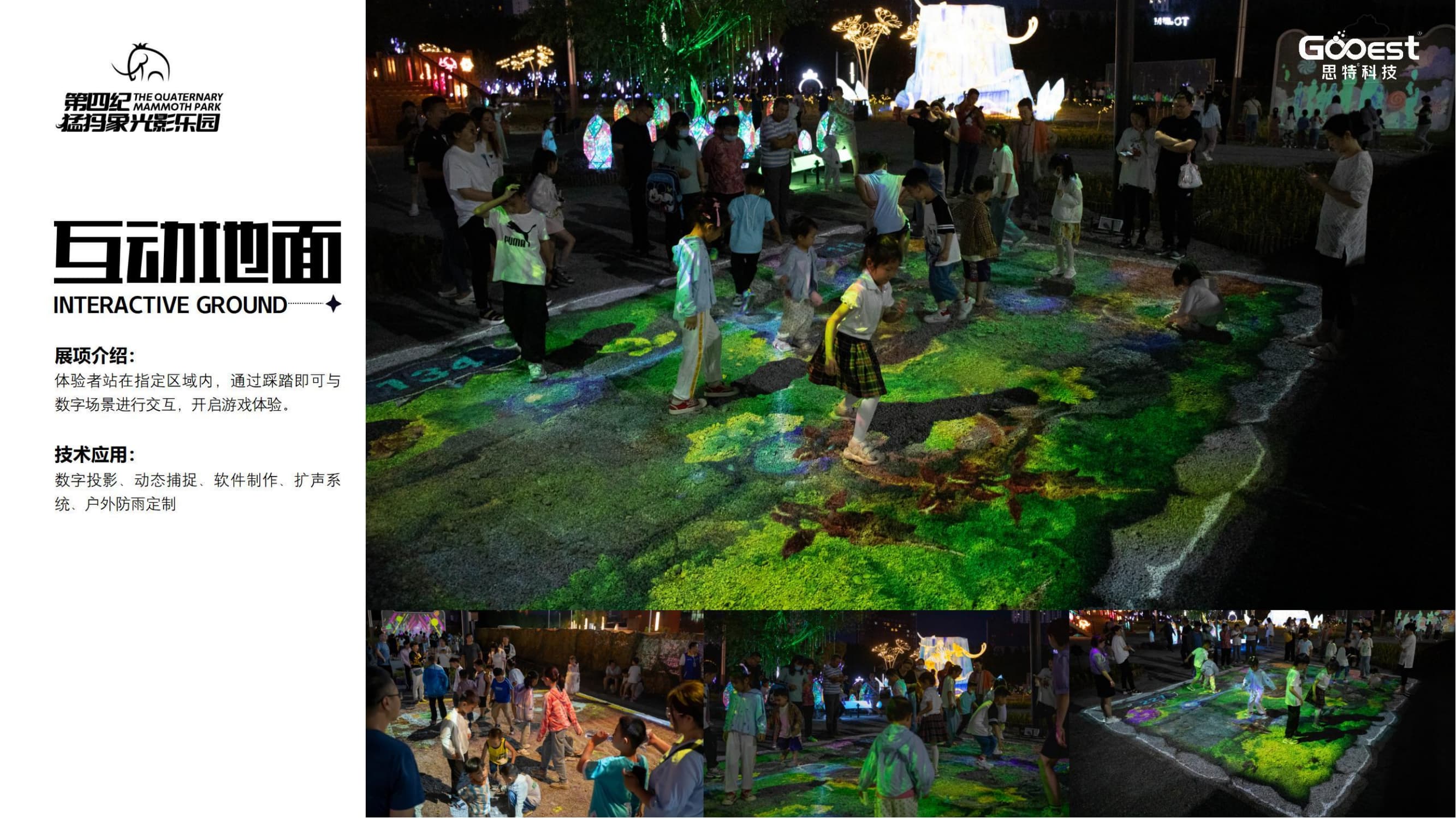 「第四纪猛犸象光影乐园」是思特科技倾力打造的全国首个冰河时代主题夜游,首展落地大庆市博物馆后广场, 总占地面积4.8万平方米,总观览路线1.2公里,从Ip主题构思、场地规划设计、展项内容开发到投资建设运营,历时两个多月,展出时长共4个月。未来, 「第四纪猛犸象光影乐园」计划在全国进行巡展。