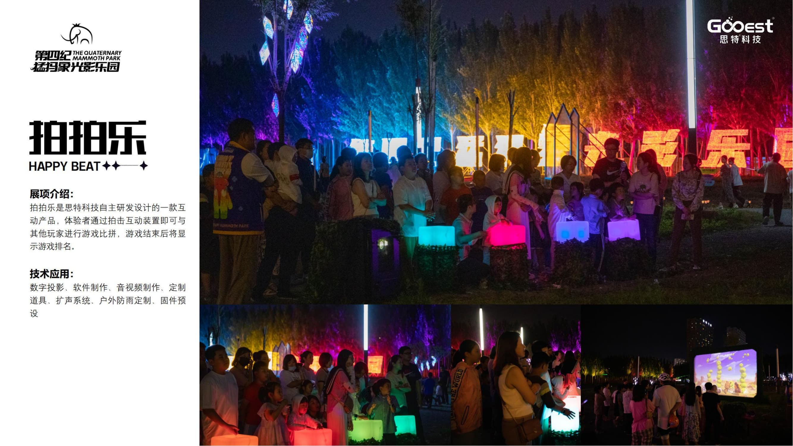 「第四纪猛犸象光影乐园」火爆开园和成功上线,来源于思特科技在项目总体运营方面的全力投入, 包括票务系统、衍生系统、商务系统、日常运营系统等SOP搭建,以及在媒介宣发、活动策划、异业合作等环节的创意融入,实现了项目的实时监控、 持续优化和快速迭代升级,为打造现象级主题夜游提供了坚实保障。