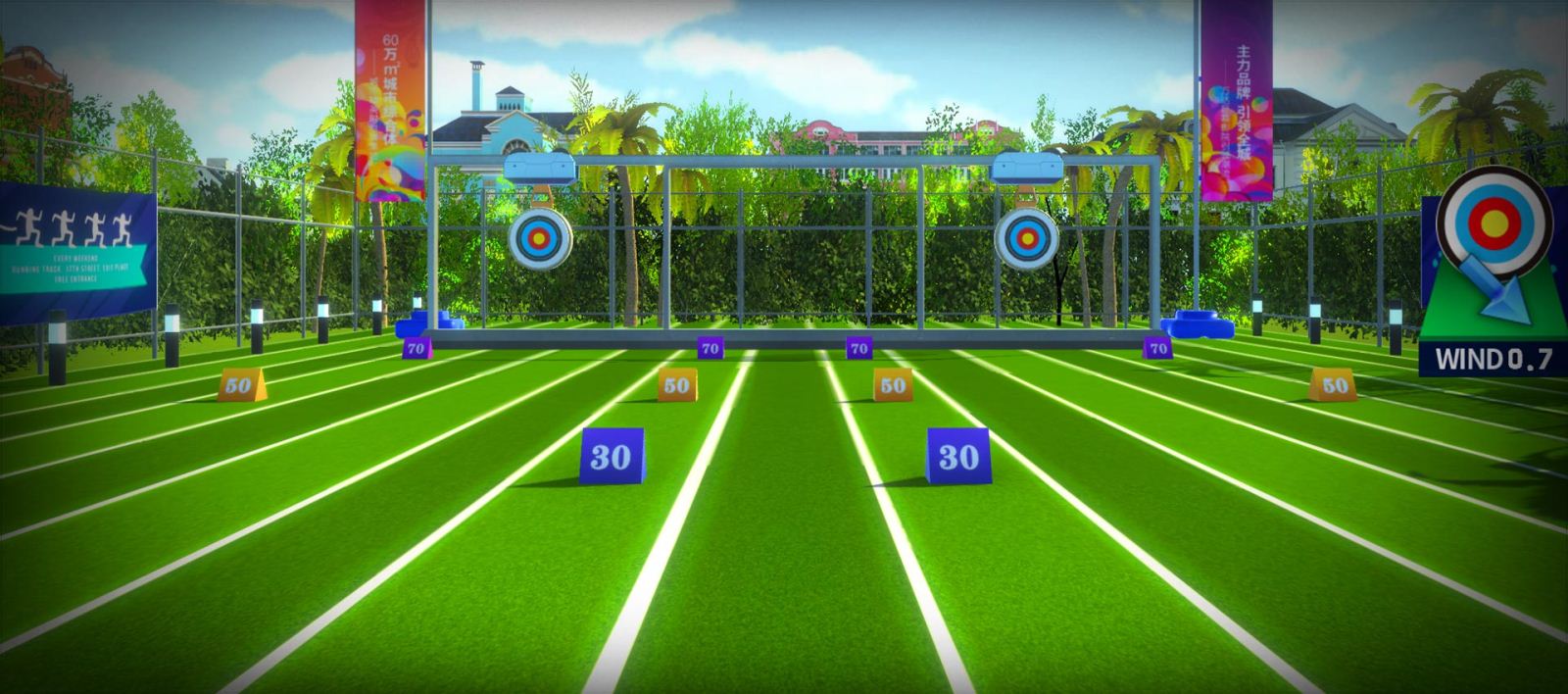 基于传统的形式进行大胆的创新和设计,模拟现实不同环境下的射箭场地,打破时间、空间的界限,增加运动的包容性。丰富的模式、天气系统(风、雨)以及场景的设计,结合场地的独特设计和360°的音效环绕,形成沉浸式体验。