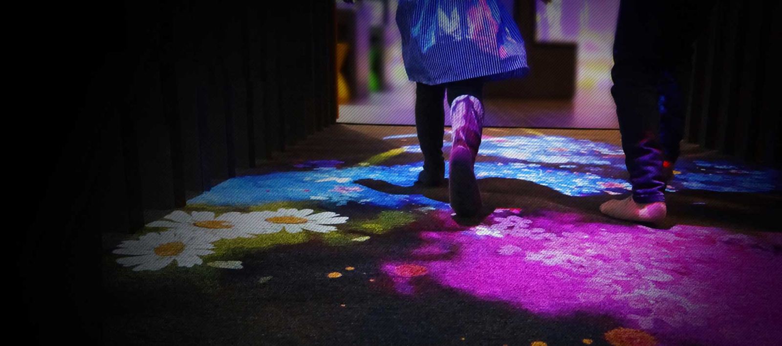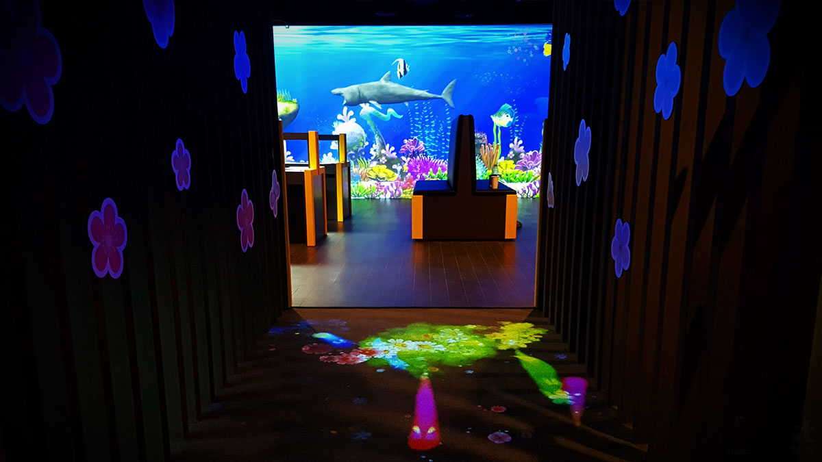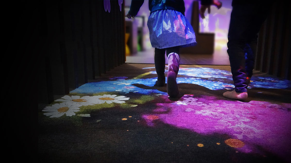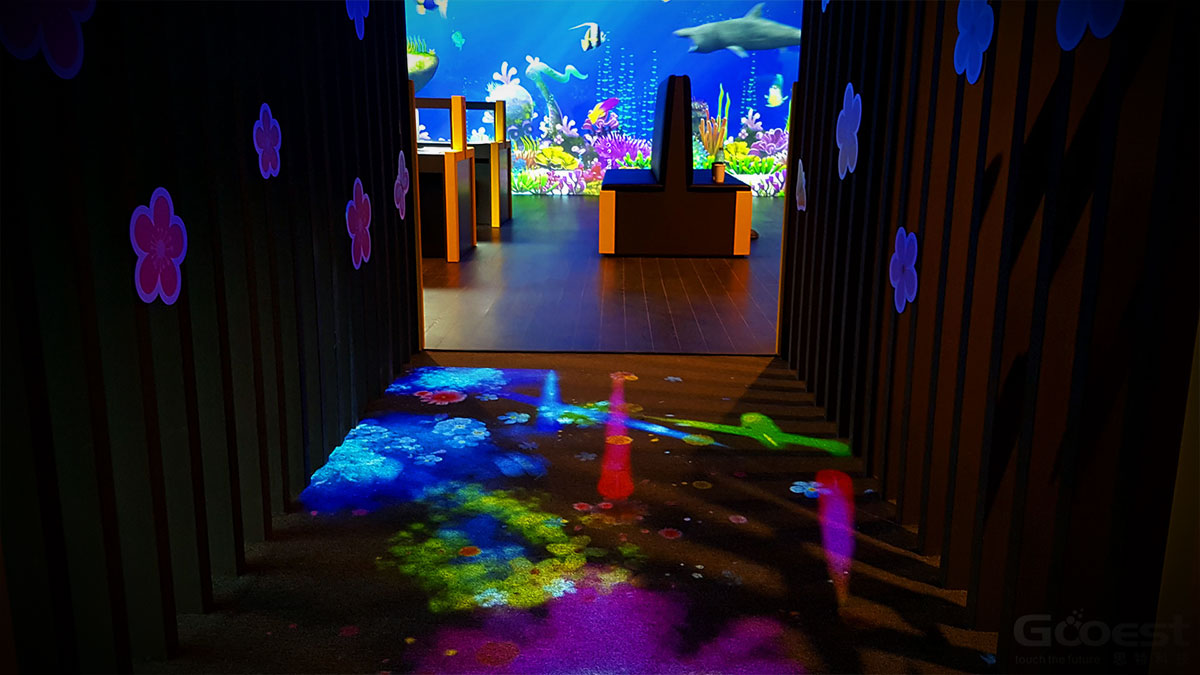 通过踩踏地面上的投影区域,触发各种不同互动效果