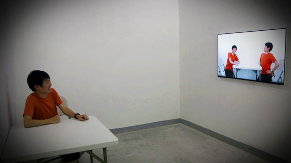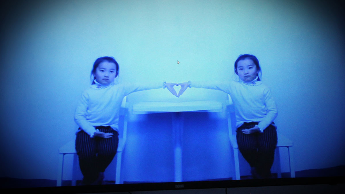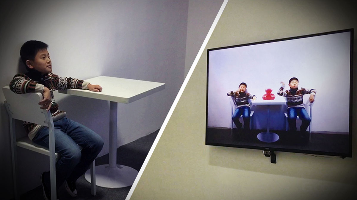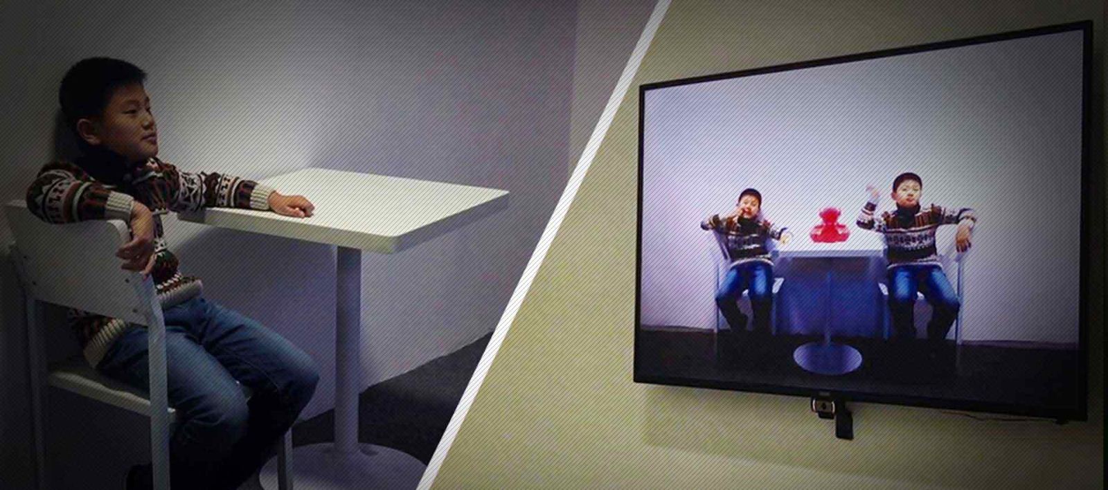 坐在椅上上与画面中的自己互动