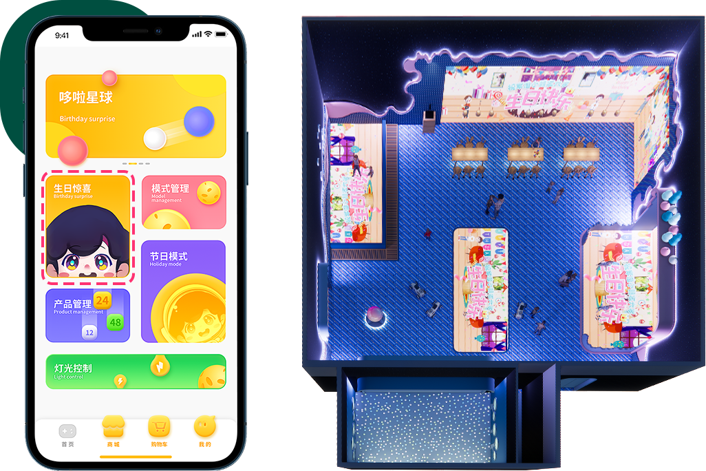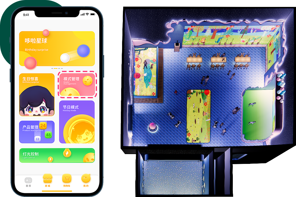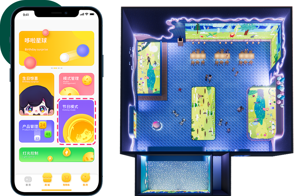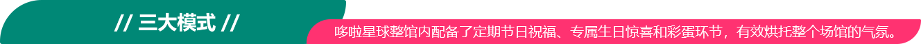 哆啦星球,现拥有三大模式管理、六大主题切换、整馆灯光设备管控等功能,并统一通过智能APP进行集中管理控制。
