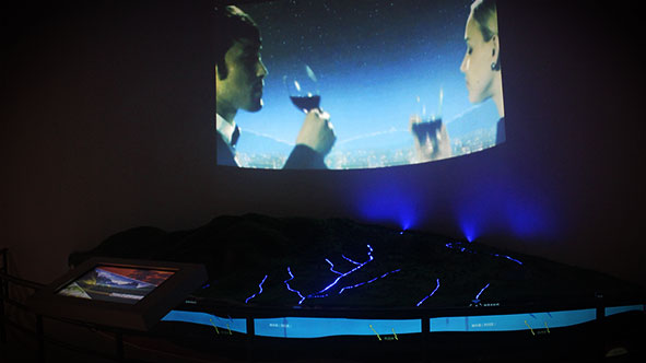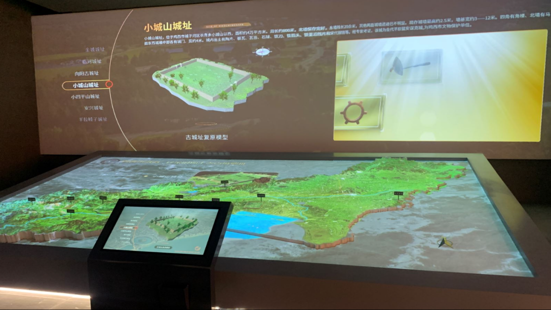为了展示大锅盔山、小四平山等城址的出土文物及城址的图片、文献。技术团队利用大型全息数字沙盘、墙面超清投影、触控操作台,打造了《古城址数字沙盘》。实现墙、地、屏活态化、可视化。多端同步联动演绎,增强虚拟现实,加强旅客的参与感。