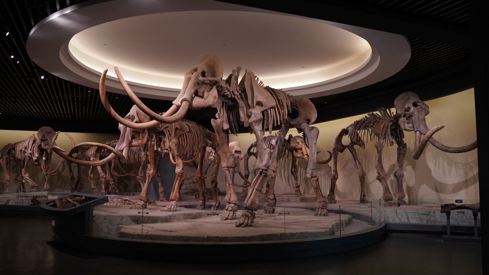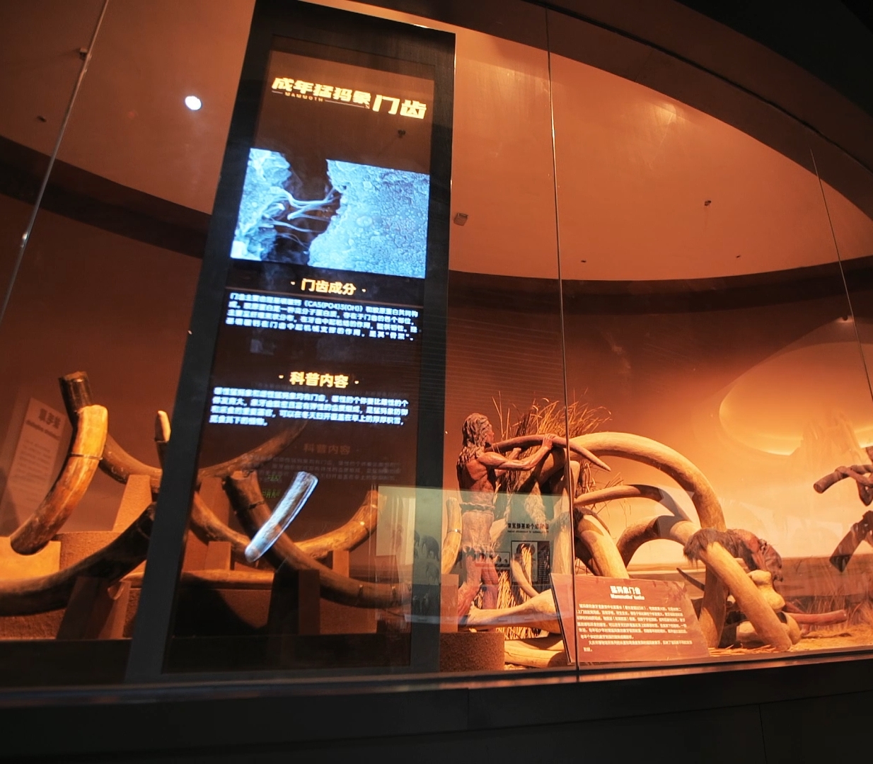 ♦猛犸象门齿♦为展示场景添加透明滑轨屏幕,屏幕可延滑轨自行移动,随着屏幕位置的变化,其上的展示内容也会随之变化,分别介绍幼年猛犸象、层年猛犸象和老年猛犸象的门齿特点以及古人类对猛犸象门齿的使用