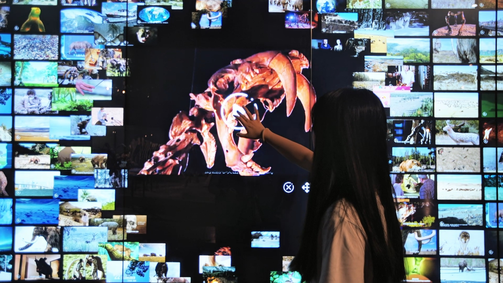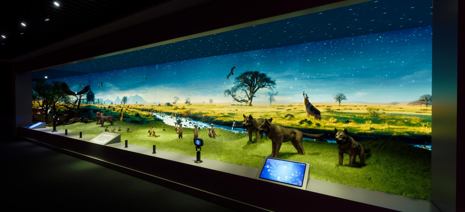 ♦第四纪草原景观♦使用高清激光数字影像在场景的主展墙上还原出巨幅的第四纪平原环境的动态画面,对展示场景的实体展台部分进行重新设计,结合环绕立体声技术,将展示场景打造成沉浸式光影科普空间互动展台 包含两个触控知识查询,两个增强现实互动和两个化石展柜