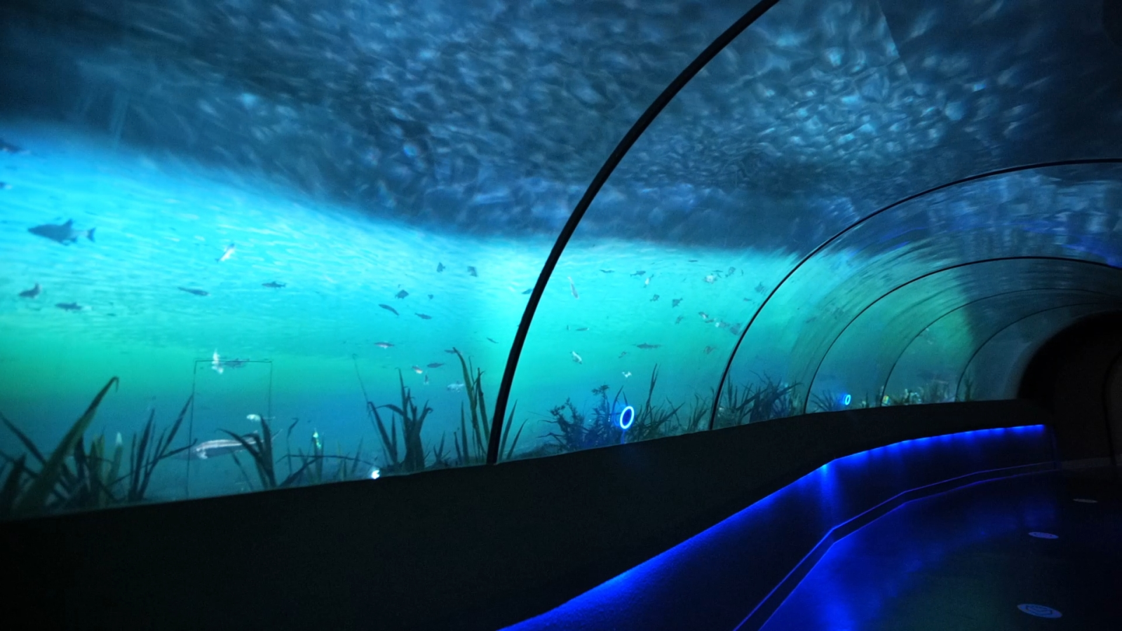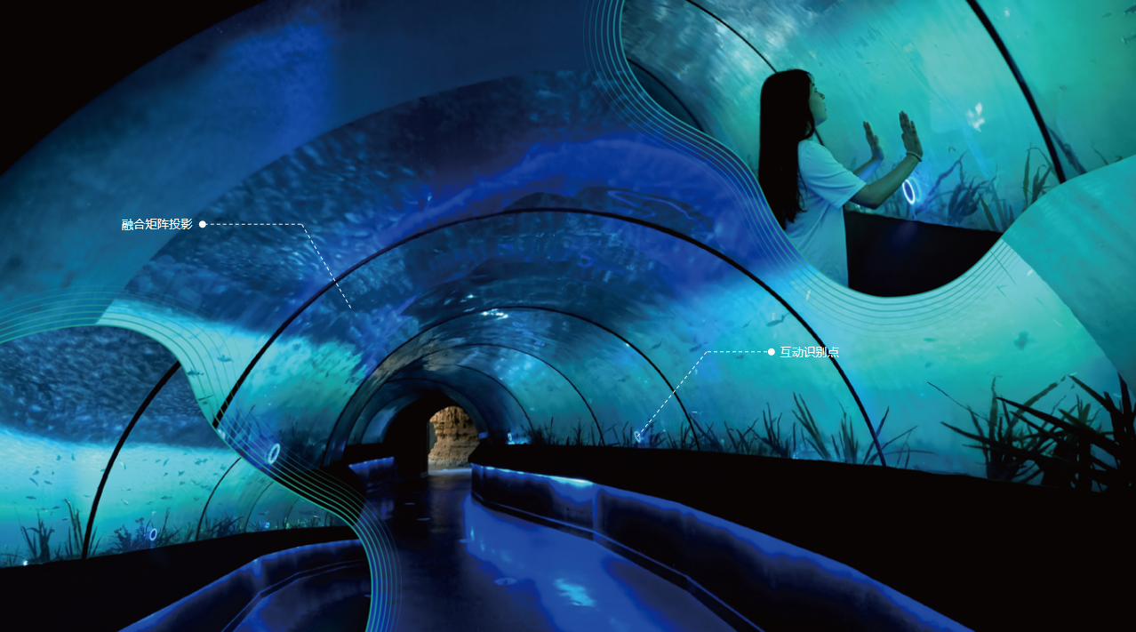 ♦穿越湖底♦展示场景由高清数字投影、水纹灯和电容感应触控互动装置构成互动形式:通过触摸通道一侧玻璃上装配有可互动的发光触摸点,触摸后在墙面侧对应区域出现飘荡的鱼食向下飘落,鱼儿会游向鱼食,靠近啄食观众触碰甬道两侧玻璃上的电容互动点位,对应的墙面数字场景中会落下鱼食,引来周围的鱼群抢食