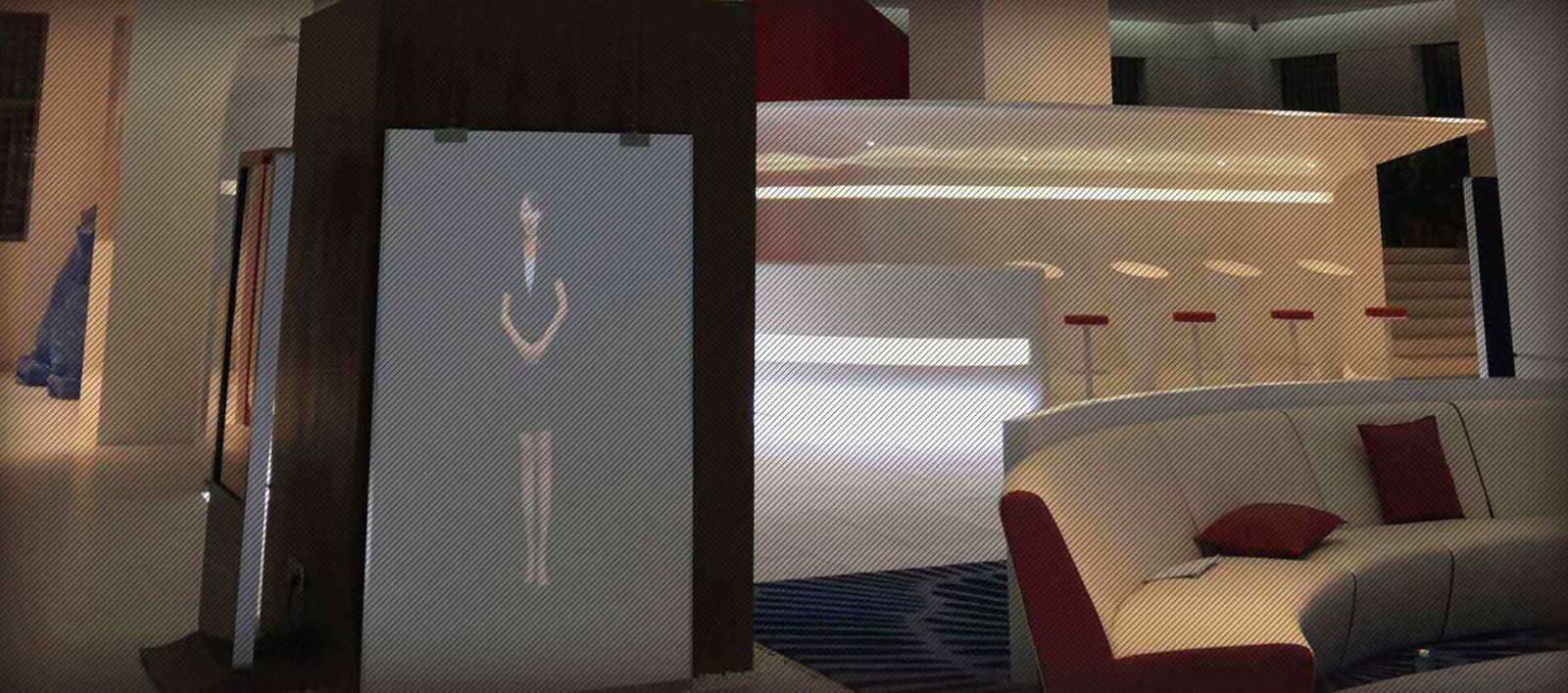 虚拟门迎,运用红外感应系统、全息成像、三维动画、投影机背投等技术,将迎宾员形象投射到特制玻璃屏幕或LED大屏幕上,形成悬浮空中的视觉效果,在参观中为观众指明游览方向。