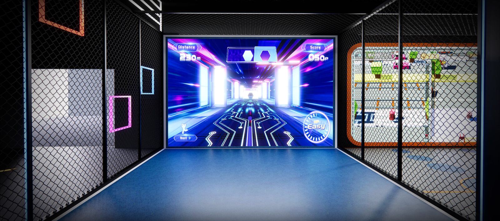通过触摸屏选择模式,在互动区域开始游戏,根据画面提示快速反应,配合造型动作穿过游戏跑道上的图形墙面。