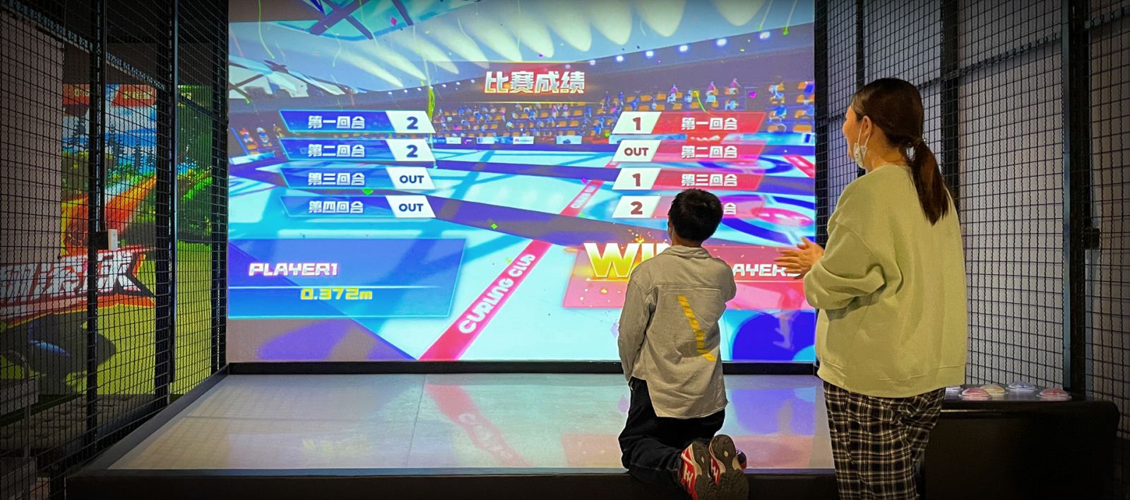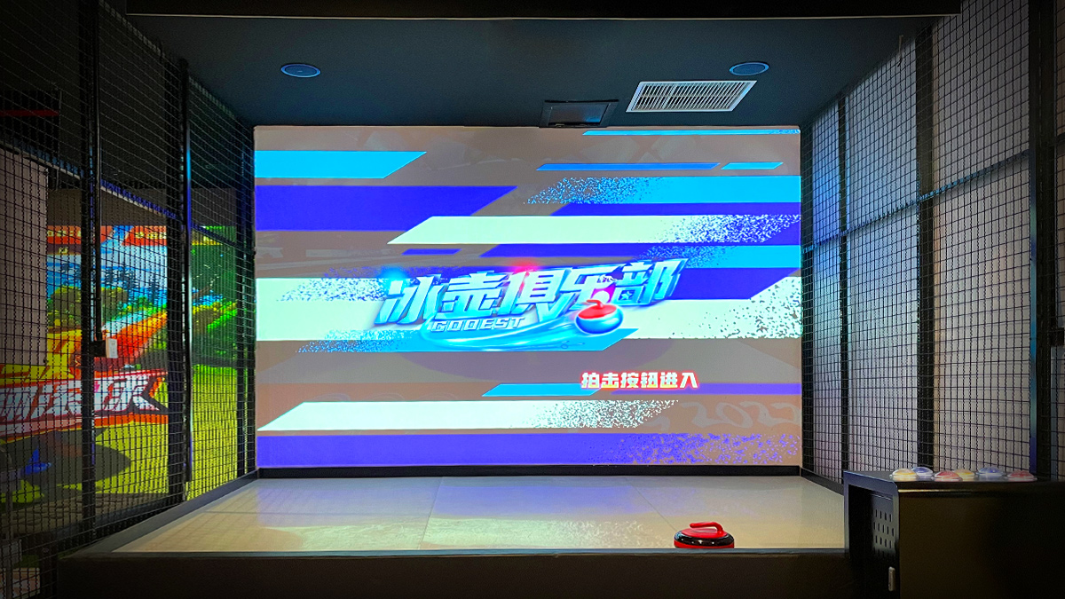 体验者通过按钮装置选择模式,按照提示推动实体冰壶道具撞击墙面触发开始,通过左右方位,加速,减速四个装置按钮调整冰壶运动状态,最终停在圆形得分区域,通过关卡/击败对手。