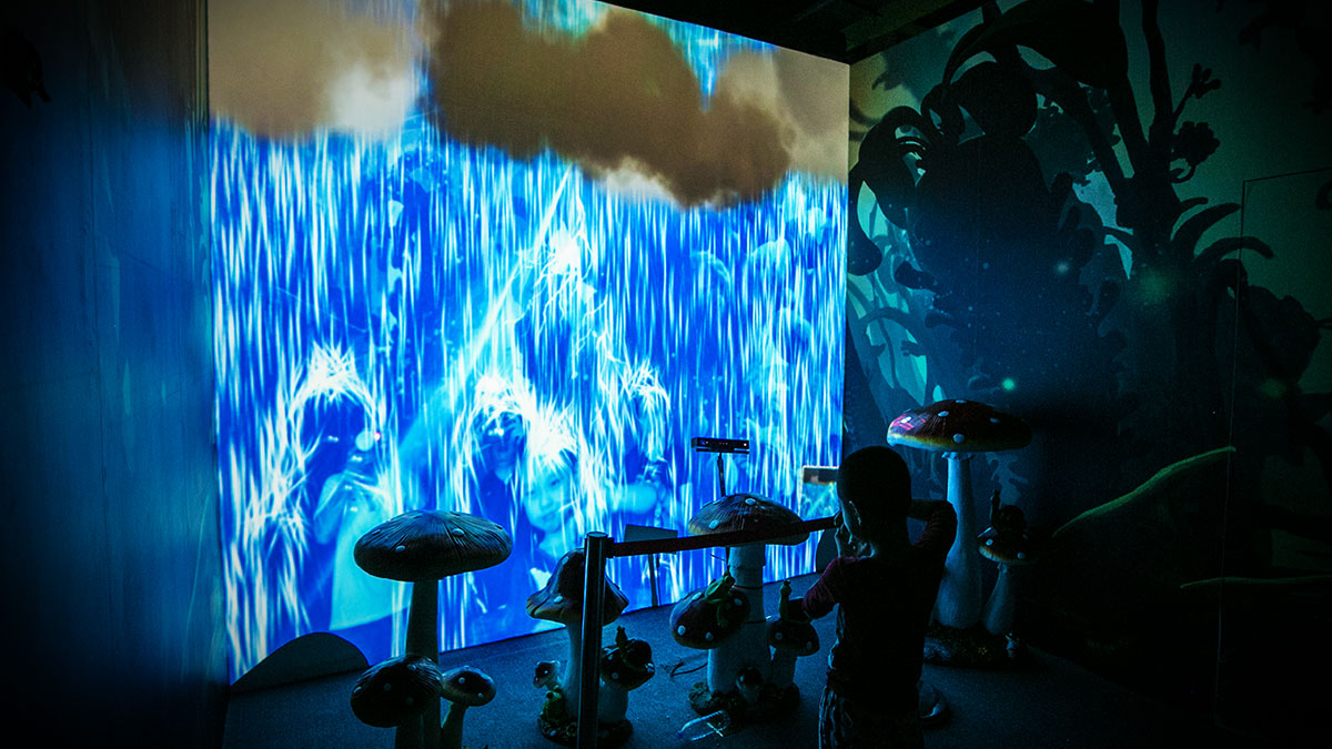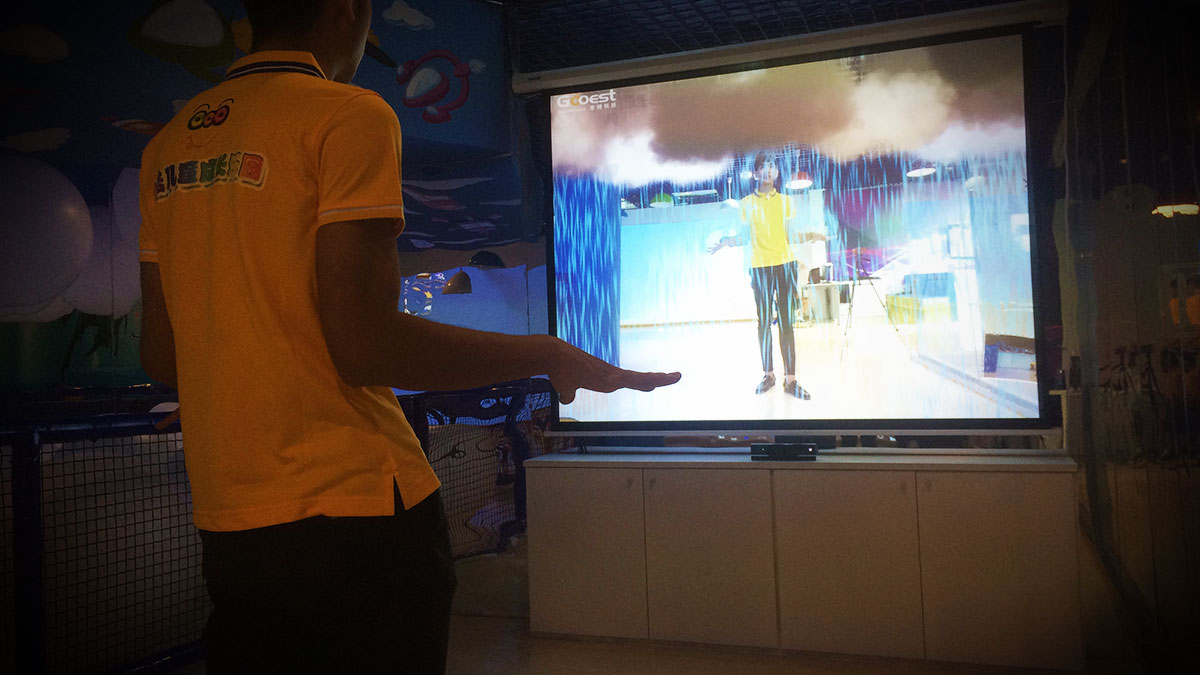 当体验者站在雨水中,切身感受随着肢体变化就能呼风唤雨的神奇特效!雨水会沿着影像轮廓流下,身临其境的体验下雨效果。