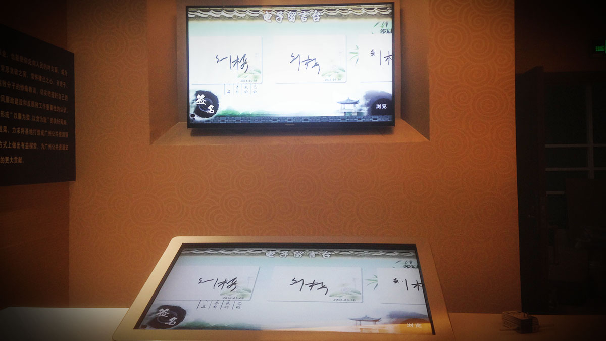 互动签名系统摒弃了传统的纸质留言的方式,利用高科技多媒体技术让参观者在参观后利用手写触摸的方式在电子留言墙上写下感言,并留下自己的名字。思特互动电子签名系统完全可以替代传统的笔式纸质签名,而且凭借先进的动作捕捉软件可最大限度的体现中国书法的美感,使得以前色彩单调仅止于手写文字和手绘图形的纸质留言薄变得五彩缤纷,同时系统操作界面简洁现代感强、书写流畅,可以通过手写方式进行输入,系统的摄像头随时可以为签名人拍照,签名文件可以生成二维码分享到微信朋友圈里,与朋友一起分享你的签名照。